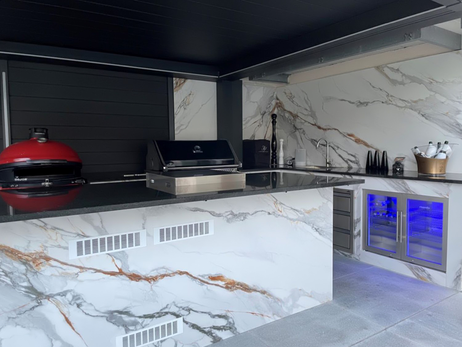 Eine Outdoor- oder Pantryküche ist immer etwas sehr Besonderes, egal ob groß oder klein, diese sollte einfach robust und witterungsunabhängig sein. Der Korpus Ihrer Outdoorküche lässt sich schnell und leicht aus unserem Produkt WakuStone errichten. Die Konstruktion kann natürlich mit unseren edlen Keramik- oder robusten Natursteinplatten bekleidet werden, so wie Sie es sich vorstellen. Wie die Küche innen, diese wird automatisch die Gäste anziehen und damit zum Mittelpunkt einer Feier werden. Wir empfehlen die Arbeitsplatte aus Keramik mit passenden Seitenverkleidungen, weil die Keramik hochbelastbar ist, dabei frostsicher, Hitze- und UV-beständig und natürlich würden wir alles soweit vorkonfektionieren, damit der Aufbau schnell vonstatten geht.